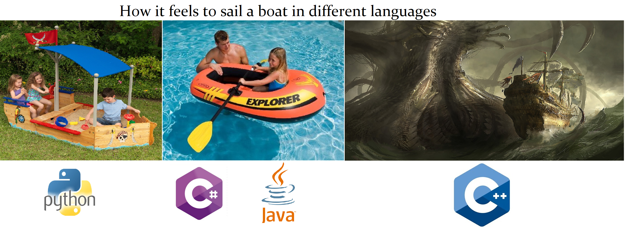ProgrammerHumor: How it feels to sail a boat in different programming languages