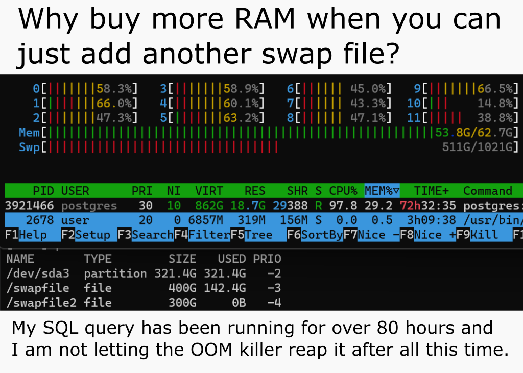 ProgrammerHumor: whyBuyMoreRAMWhenYouCanAddAnotherSwapFile
