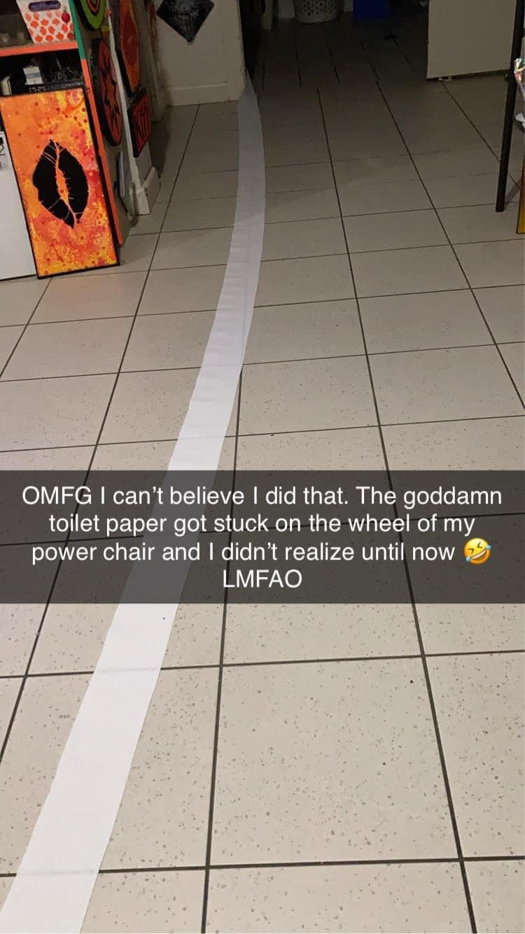 Wellthatsucks: Toilet paper got stuck to my wheelchair. Didn't notice until I'd pulled it across the room