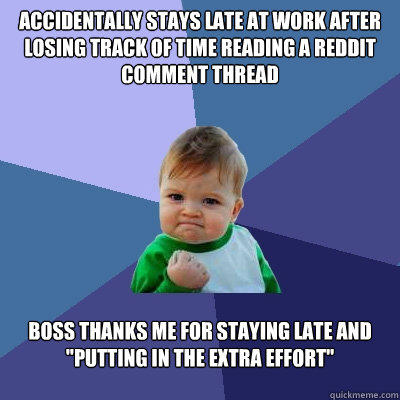 Accidentally stays late at work after losing track of time reading a reddit comment thread Boss thanks me for staying late and "putting in the extra effort"
